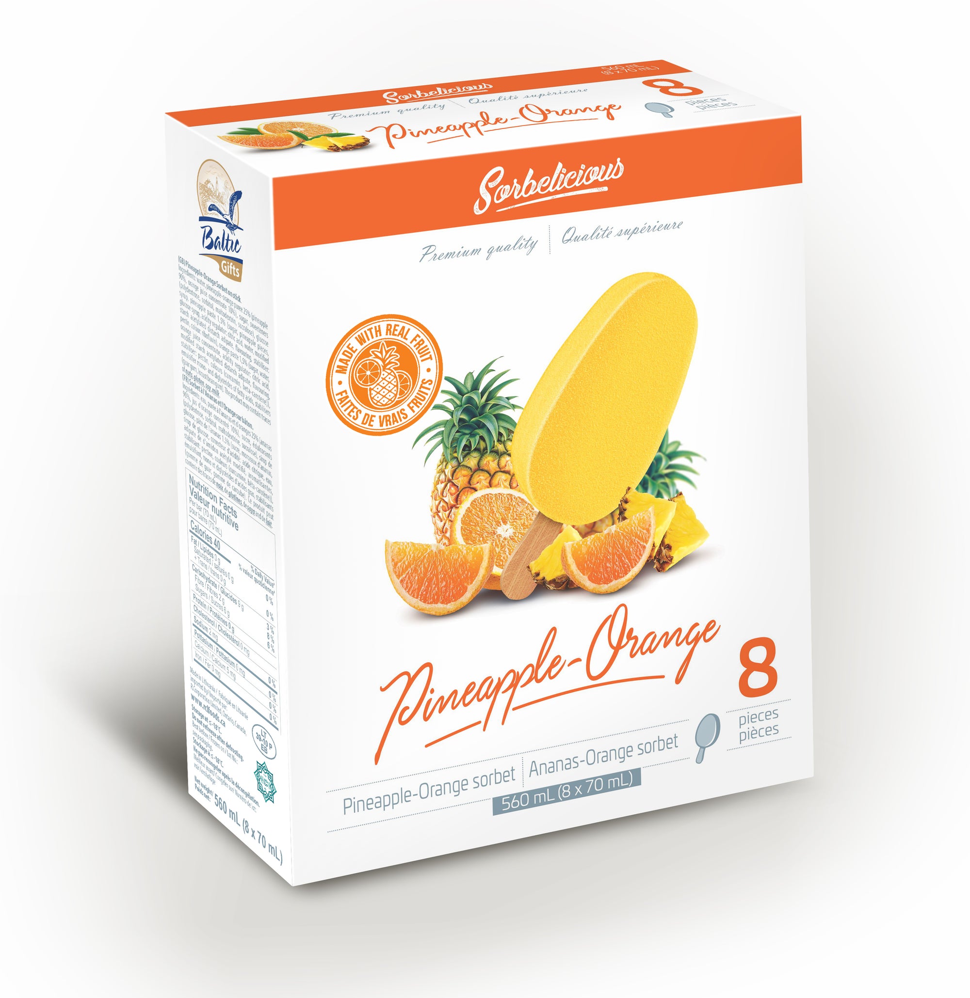 Introducing Sorbelicious Pineapple Orange Fusion, a tropical delight that combines the flavors of juicy pineapples and zesty oranges. With its smooth and creamy texture, this sorbet bar offers a refreshing and irresistible taste experience.